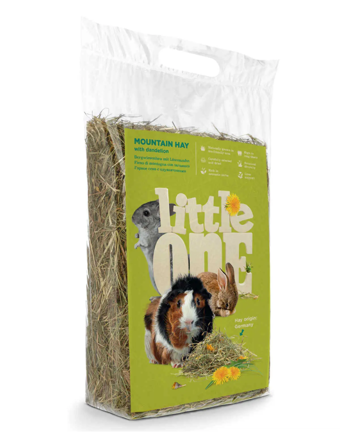 Little One Mountain El heno con diente de león es una hierba secada de forma natural. Como el heno es una parte importante de la dieta de todas las mascotas herbívoras, es necesario proporcionarle acceso ilimitado a heno. Hay Little One tiene una rica diversidad botánica; Proporciona la fibra esencial necesaria para la salud dental y la digestión adecuada. Enriquecido con diente de león extra. El diente de león es rico en vitaminas y minerales. Debido a la variedad del contenido de nutrientes, el diente de león tiene propiedades analgésicas, antiinflamatorias, sedantes y otras útiles. El diente de león tiene un efecto positivo en el sistema cardiovascular, el hígado y los riñones.