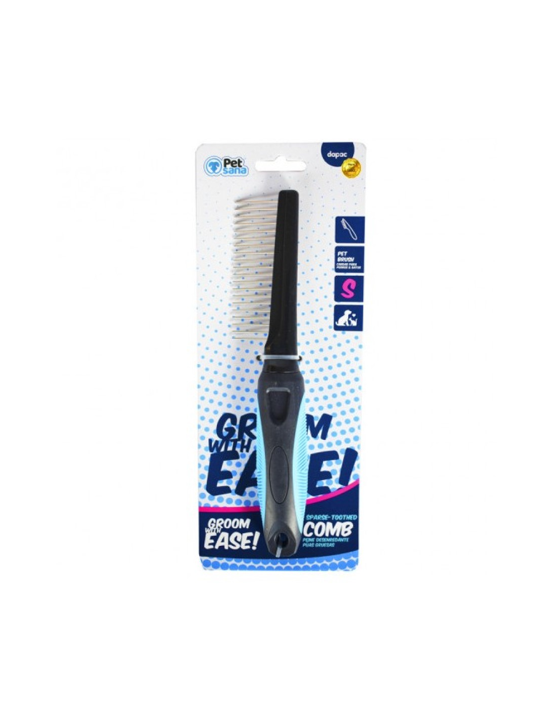 Peine desenredante de púa estándar para perros y gatos. Puntas redondeadas para no dañar la piel de la mascota. Mango antideslizante y ergonómico de color azul.