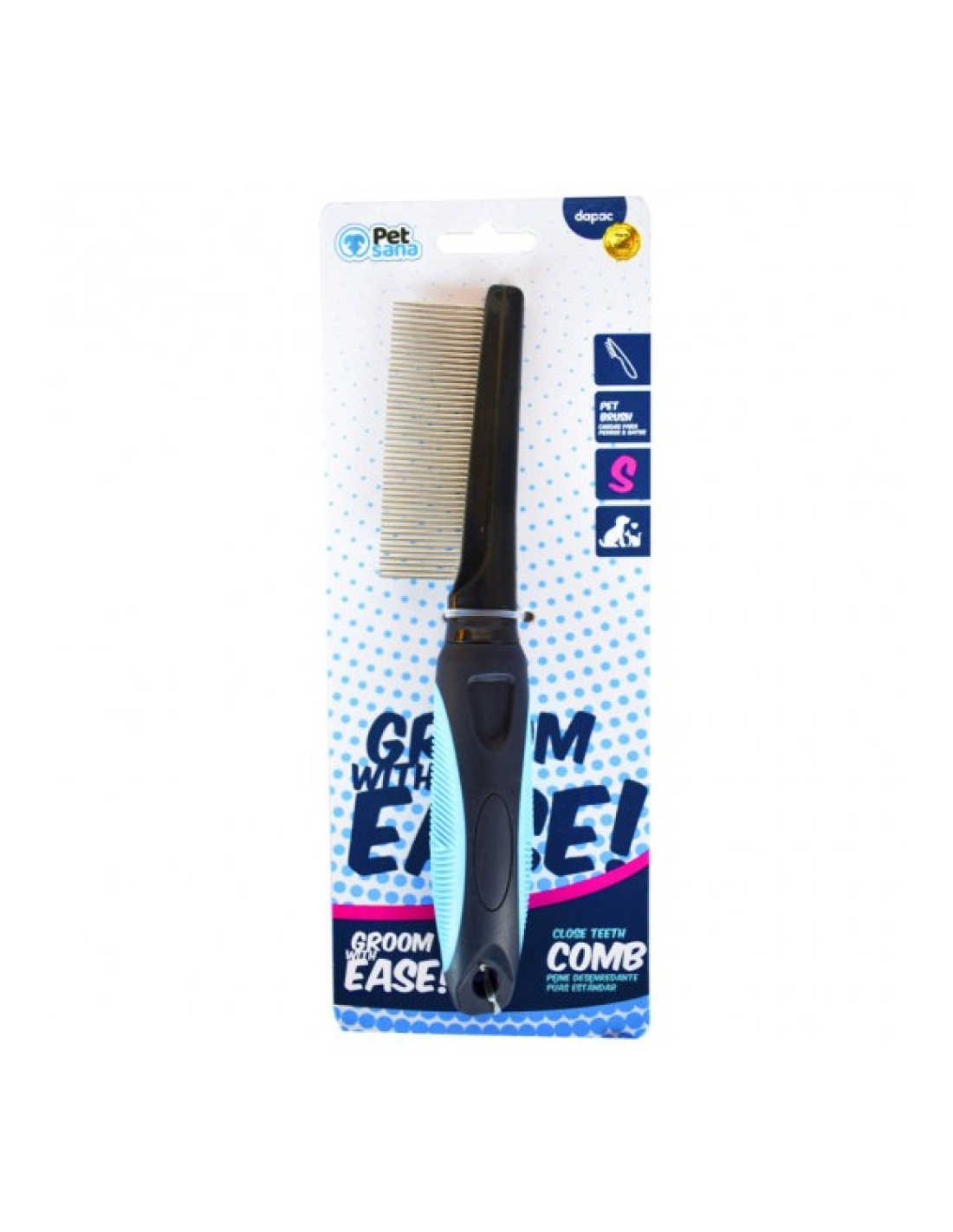 Peine desenredante de púa gruesa-cerrada para perros y gatos. Puntas redondeadas para no dañar la piel de la mascota. Mango antideslizante y ergonómico de color azul.