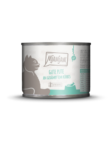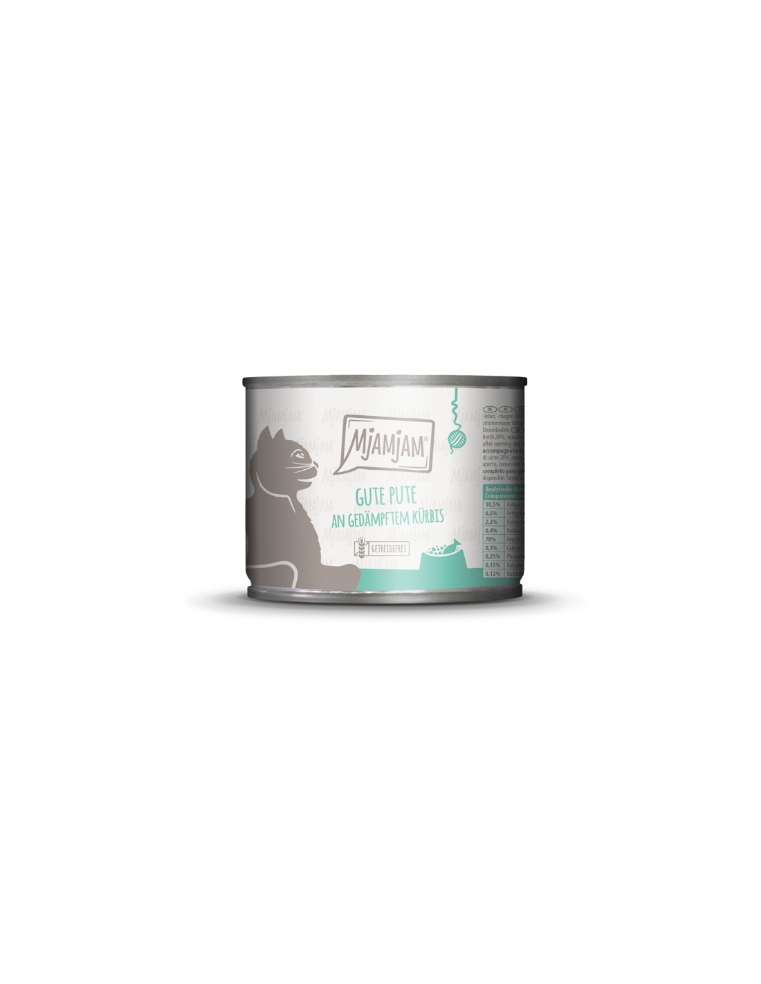 La comida para gatos MjAMjAM se compone de ingredientes seleccionados que se producen principalmente en granjas regionales. La preparación se lleva a cabo en Alemania en un suave proceso de cocción al vapor para que los nutrientes importantes y las sustancias vitales se conserven de la mejor manera posible. El alimento se elabora sin harinas animales ni azúcares añadidos, así como sin cereales ni gluten, por lo que es adecuado para gatos con las correspondientes intolerancias y alergias.