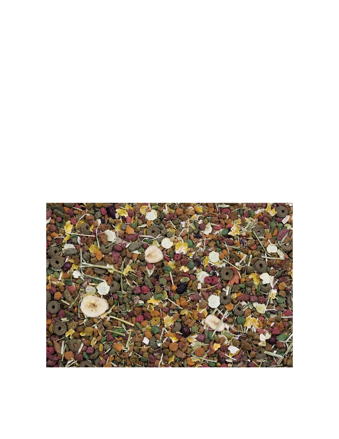 subproductos de origen vegetal, cereales, (pimientos 6,0%*, zanahorias 4,0%*, remolacha roja 2,5%*), frutas (plátano 3,0%*, manzana 3,0%*), extractos de proteínas vegetales, semillas, sustancias minerales, nueces, levaduras, FOS, aceites y grasas, extracto de caléndula, MOS, algas, hierbas, yuca*frutas y vegetales deshidratados, % equivalente antes del secado