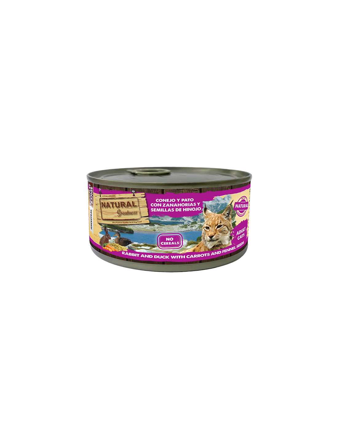 Composición: Conejo (33 %), Pato (32 %), Zanahoria (4 %), Semillas de hinojo (1 %).
