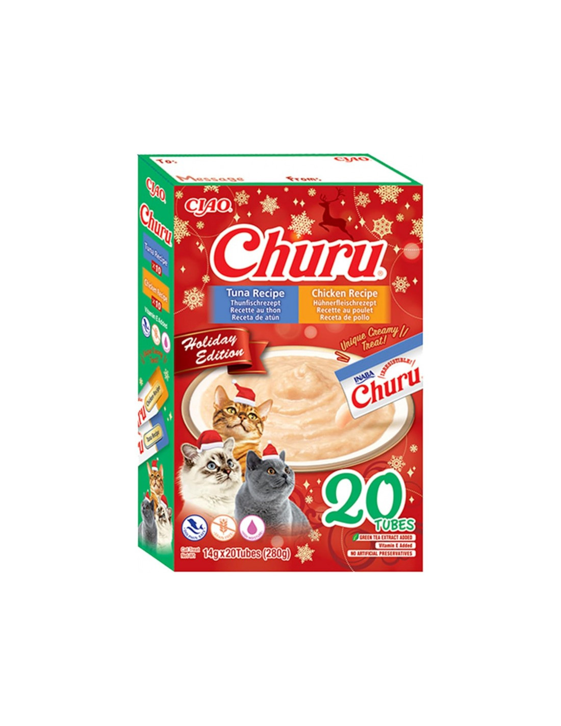 Churu Caja Navidad combina los sabores más populares —pollo y atún— en un formato festivo ideal para regalar o disfrutar junto a tu gato. Estos snacks lamibles están elaborados con pollo criado en granja y atún salvaje 100 % puros y naturales, ofreciendo una textura cremosa y un sabor que encanta a los felinos.