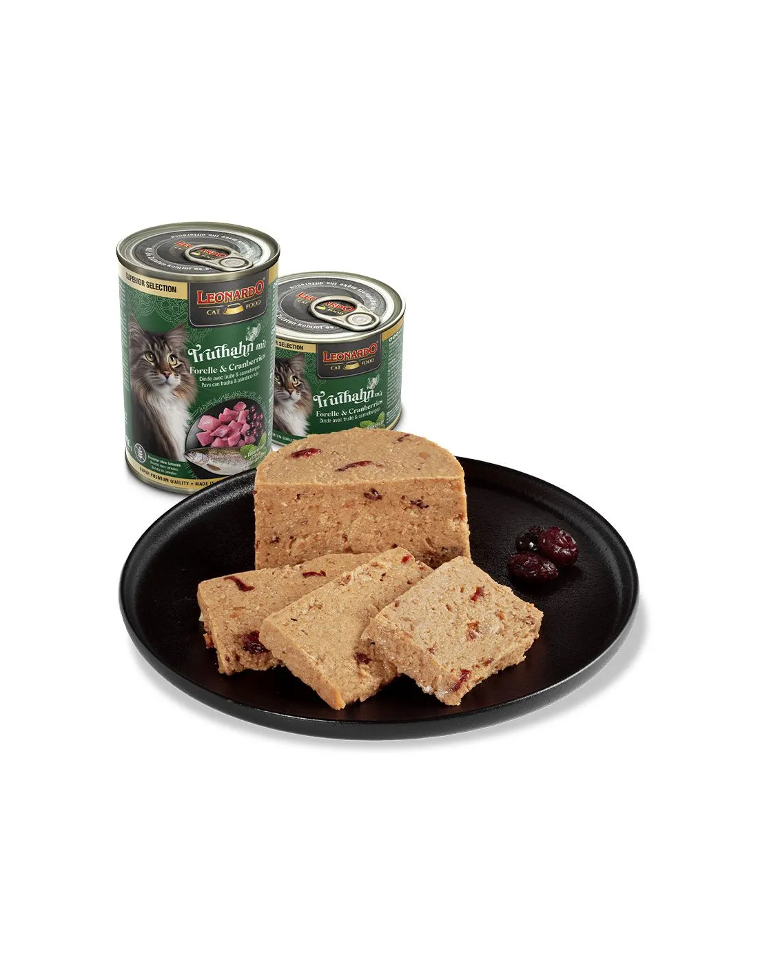 Carne, corazón, hígado y mollejas de pavo (40 %); caldo de pavo y trucha (28,8 %); trucha (26 %); arándanos rojos (4 %); minerales (0,5 %); cáscaras de huevo*¹ (0,5 %); aceite de salmón (0,1 %); menta gatuna*¹ (0,1 %) *¹secado