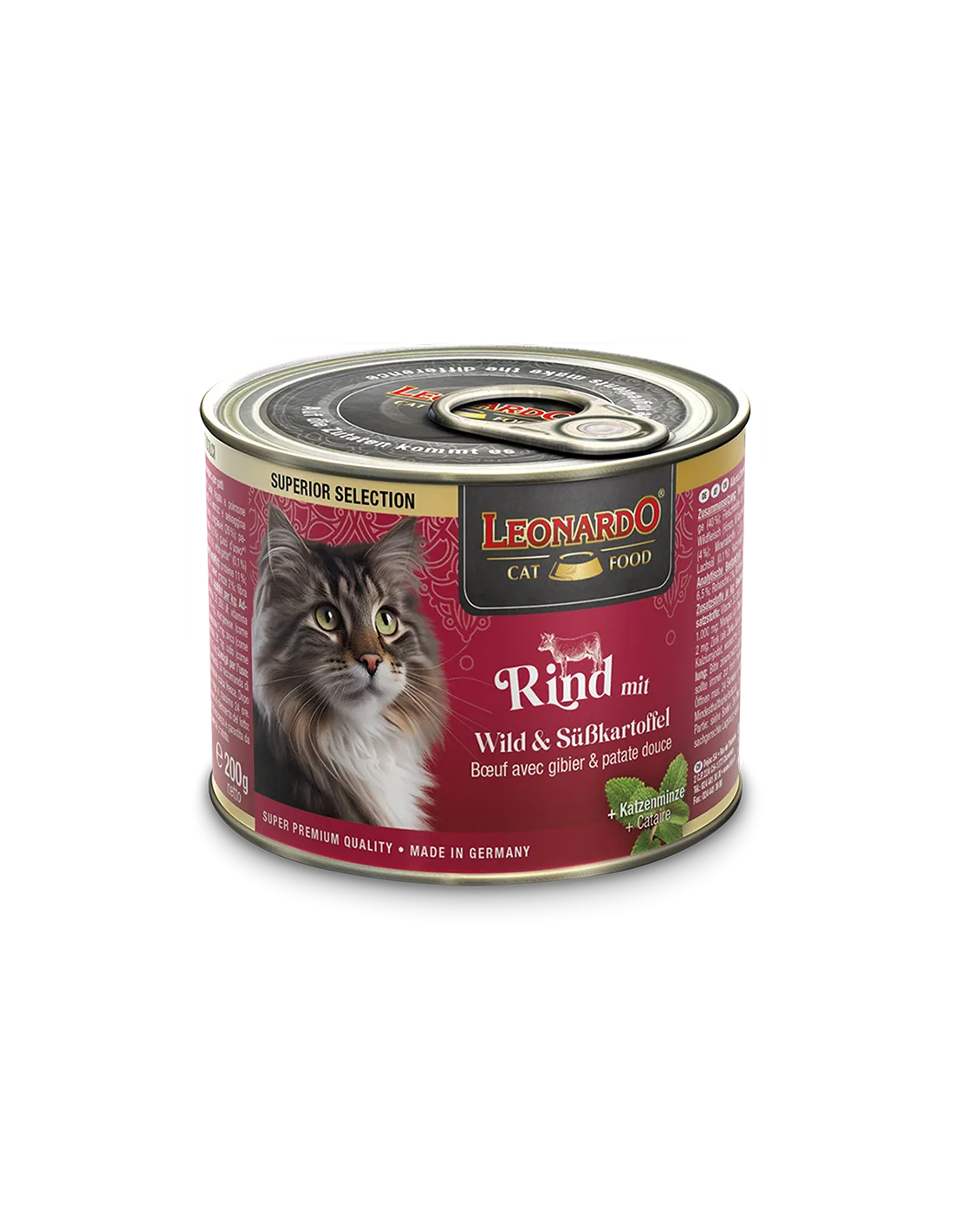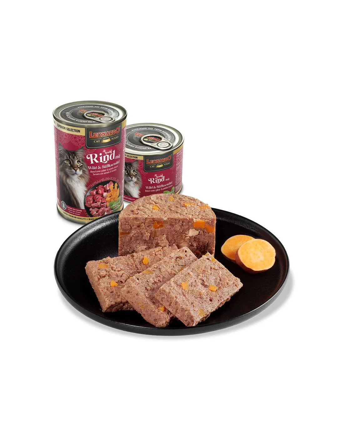 Carne, corazón, hígado y pulmón de ternera (40 %); caldo de carne de venado y ternera (28,8 %); carne de caza (venado, jabalí) (26 %); batata, boniato (4 %); minerales (0,5 %); cáscaras de huevo*¹ (0,5 %); aceite de salmón (0,1 %); menta gatuna*¹ (0,1 %) *¹secado