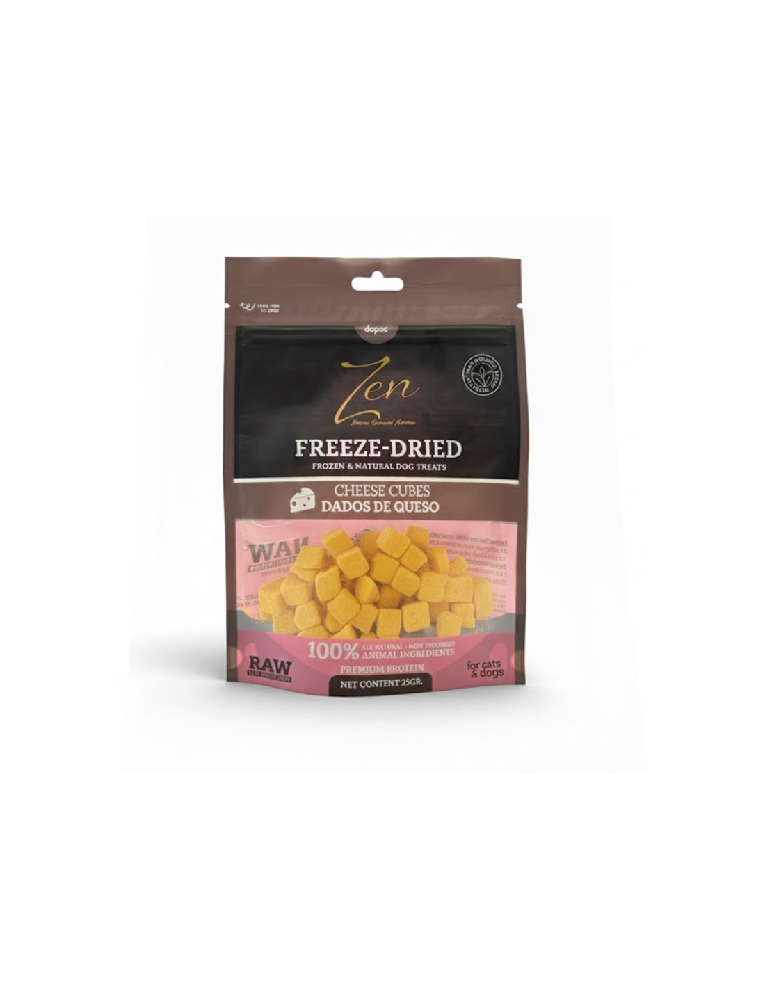Dados de queso liofilizado para perros y gatos. 100% ingrediente animal (leche de vaca), grain-free y en cubitos muy fáciles de dosificar. Textura crujiente y aroma suave: perfecto como premio o topper. Formato: 25 g con cierre zip.