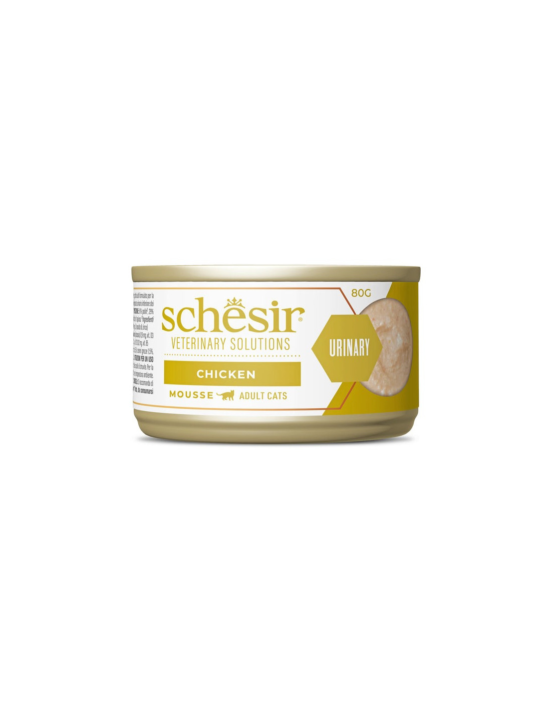 Schesir Veterinary Solution Urinary Mousse de Pollo es un alimento dietético completo y equilibrado especialmente formulado para gatos adultos con problemas urinarios o tendencia a desarrollar cálculos de estruvita. Su receta está diseñada para favorecer la disolución de los cristales existentes y reducir el riesgo de recurrencia, gracias a sus propiedades de subsaturación y acidificación de la orina, manteniendo un pH urinario saludable.