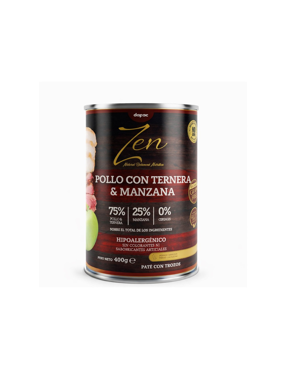 Paté con trozos elaborado con pollo fresco (41%), ternera (4%) y manzana (15,2%), cocinados en su propio caldo.