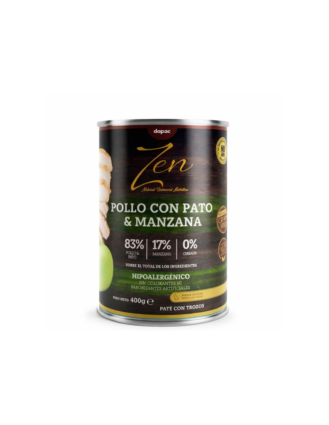 Elaborado con pollo fresco (51%) y pato (4%), cocinados en su propio caldo, con manzana (15,2%).