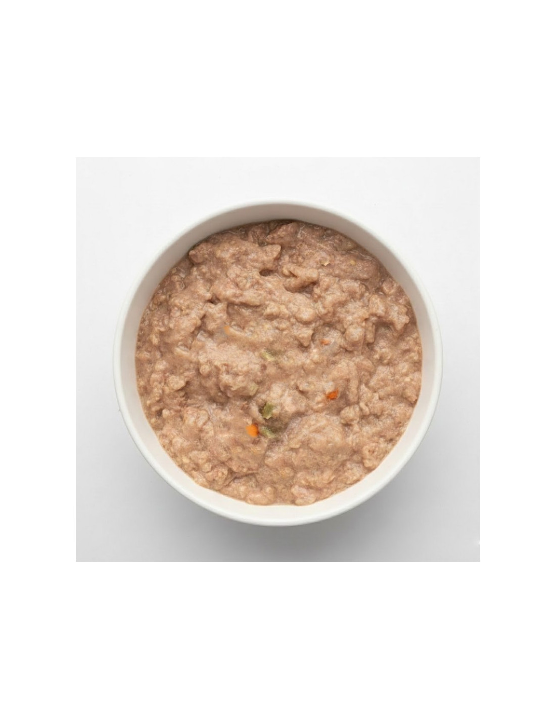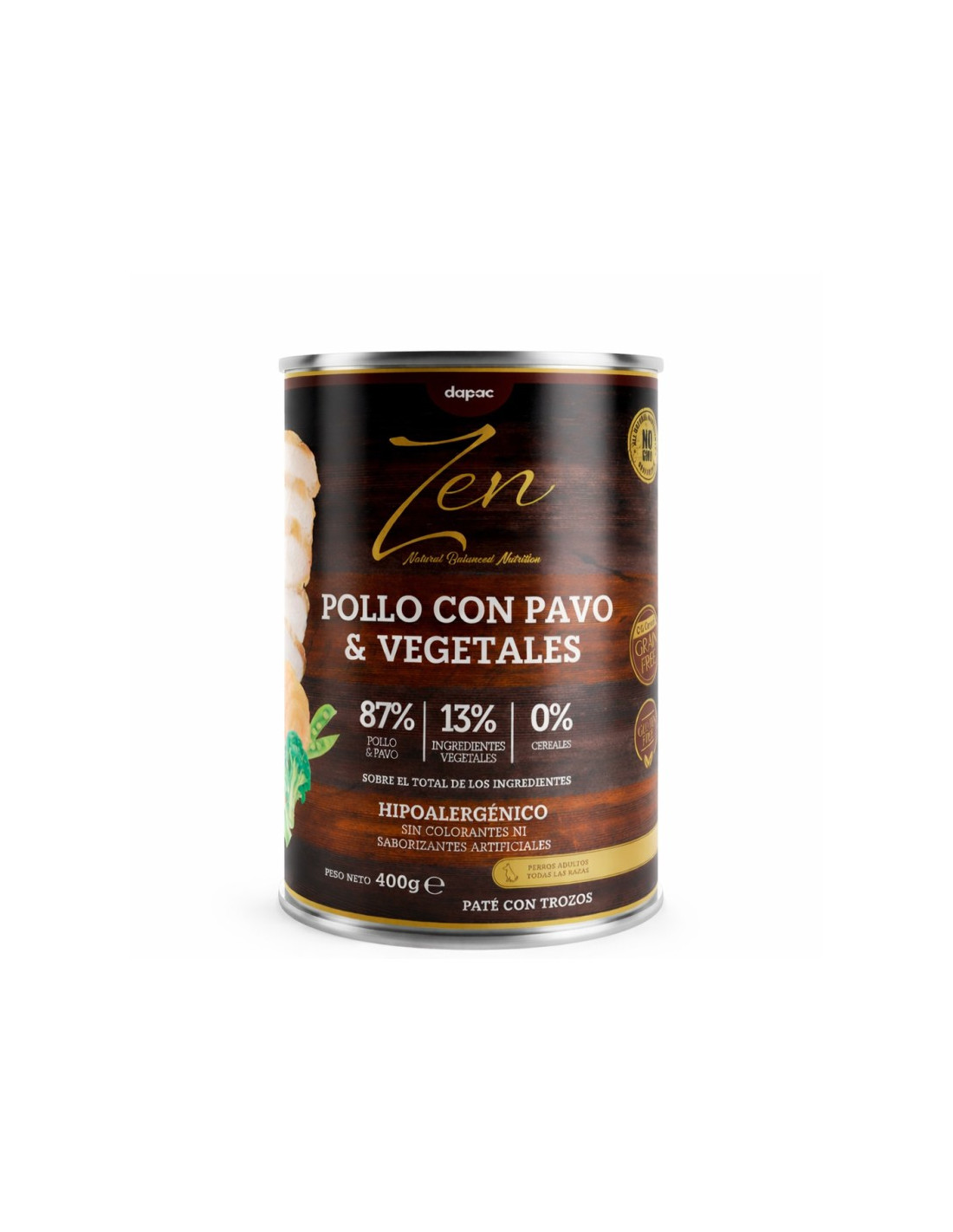 Alimento húmedo complementario para perros elaborado con pollo fresco (41%, con su caldo de cocción) y pavo (4%, con su caldo de cocción), acompañado de verduras.