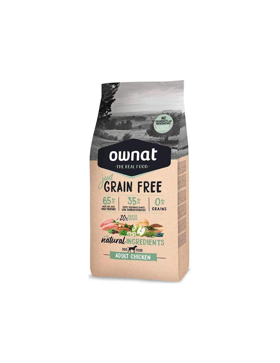 Carne deshidratada (34%), pollo fresco* (mín. 20% antes de la extrusión), guisantes enteros*, grasa avícola (preservada con antioxidantes naturales), raíces de mandioca*, patata deshidratada*, vaina de algarroba*, proteína hidrolizada de pollo, pescado deshidratado, levadura de cerveza*, pulpa de remolacha, manzana fresca* (1%), semilla de lino*, algas marinas deshidratadas*, sal gema*, aceite de pescado (preservado con antioxidantes naturales), fructo y manano oligosacáridos, alfalfa deshidratada*, glucosamina, condroitina, yucca schidigera, arándanos*, tomillo*, flor de manzanilla*, hinojo*, equinácea*, té verde*.